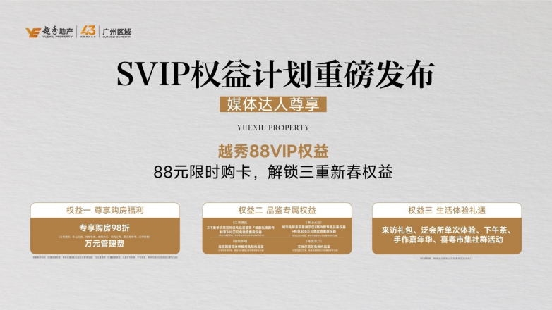 “越”享福利,共鉴美好。越秀地产广州区域八盘以此新春发布会为契机,特别推出88VIP权益卡,88元限时购卡,解锁四重新春权益: